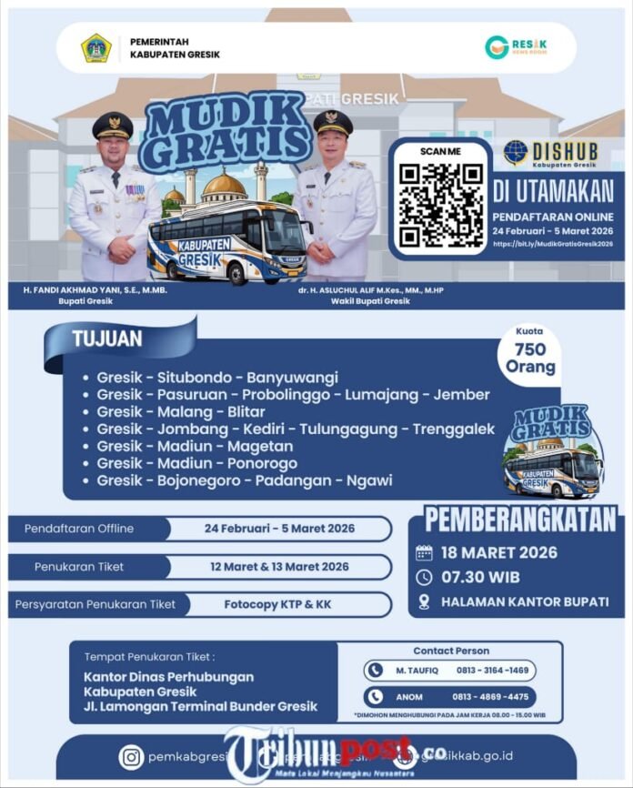 Pemerintah Kabupaten Gresik kembali menghadirkan Program Mudik Gratis 2026 bagi masyarakat yang ingin pulang kampung menjelang Hari Raya Idul Fitri. Tahun ini, sebanyak 750 kuota disediakan untuk warga yang ingin merayakan Lebaran bersama keluarga di kampung halaman.
