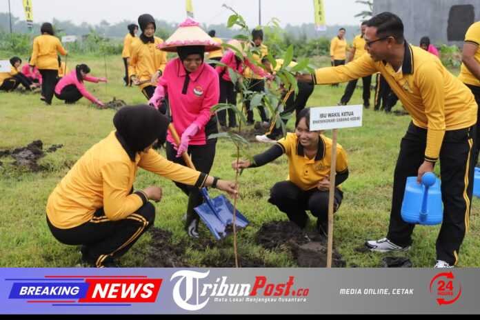 Sejumlah personel Polres Kediri Polda Jatim dan Bhayangkari bersama Dinas Lingkungan Hidup dan Perangkat Desa Sekoto turun langsung melakukan penanaman pohon sebagai bagian dari gerakan peduli lingkungan.