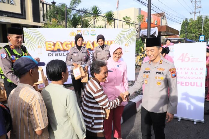 Tribunpost.co || Kediri Kota – Semangat berbagi di bulan suci Ramadan kembali ditunjukkan jajaran Polres Kediri Kota. Kapolres Kediri Kota, AKBP Anggi Saputra Ibrahim, S.H., S.I.K., M.H. didampingi Ketua Pengurus Yayasan Kemala Bhayangkari Cabang Kediri Kota, Ny. Yani Anggi menggelar kegiatan pembagian takjil, Rabu (25/2/2026) sore, di depan Mako Polsek Kota Kediri.