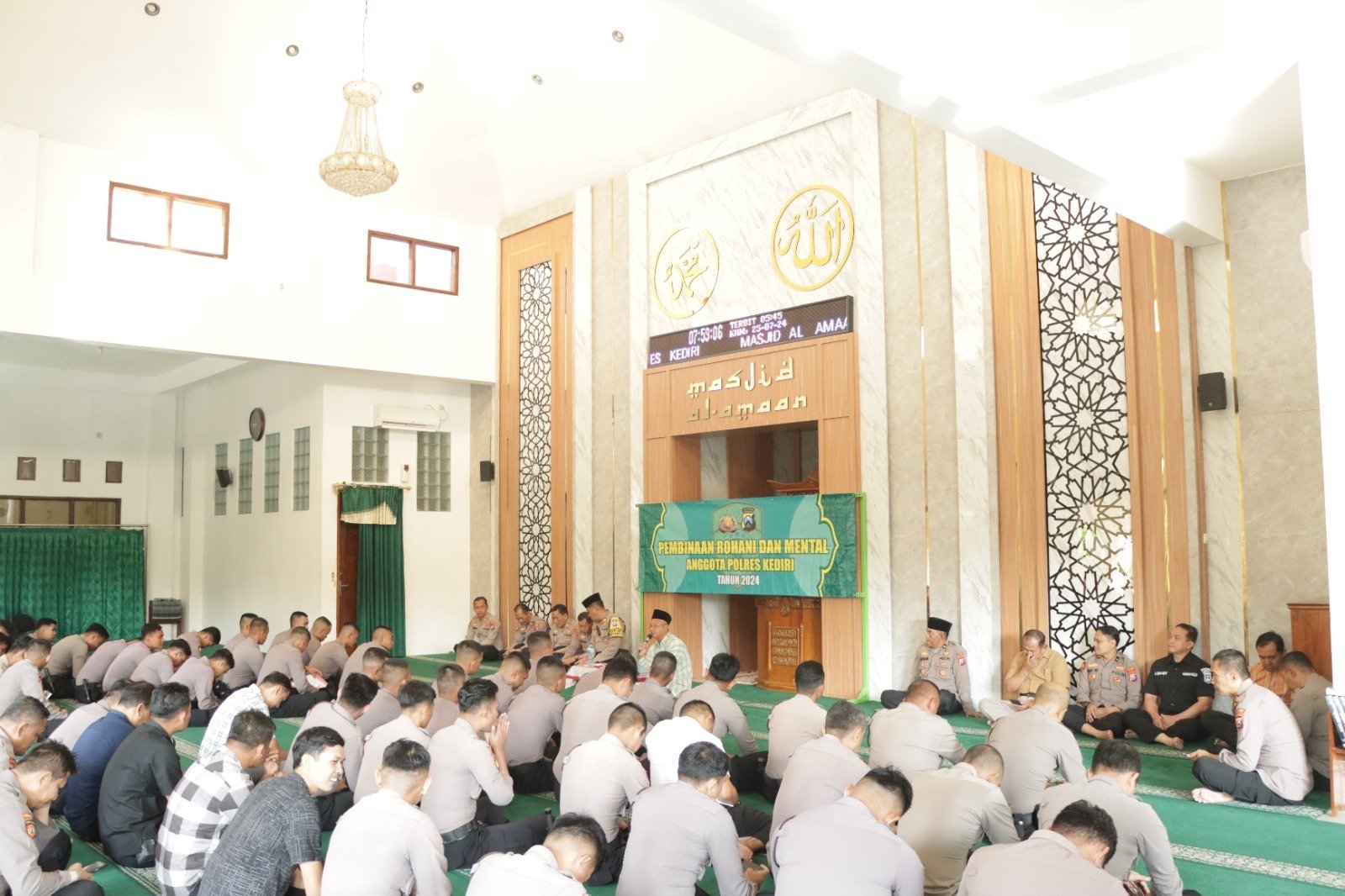 Tribunpost.co || KEDIRI– Puluhan anggota Polres Kediri Polda Jatim mengikuti kegiatan bimbingan rohani dan mental (binrohtal) di Masjid Al Aaman, Mapolres Kediri usai pelaksanaan apel pagi, Kamis (25/7/2024).