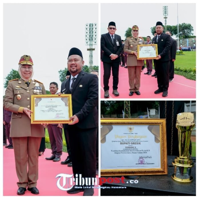 GRESIK, TRIBUNPOST.CO – Bupati Gresik Fandi Akhmad Yani menerima penghargaan sebagai Terbaik II Pembina Keselamatan dan Kesehatan Kerja (K3) tingkat Provinsi Jawa Timur. Penghargaan diserahkan langsung oleh Gubernur Jawa Timur Khofifah Indar Parawansa saat apel peringatan Bulan K3 Nasional yang digelar di Stadion Petrokimia Gresik, Rabu (14/1/2026).