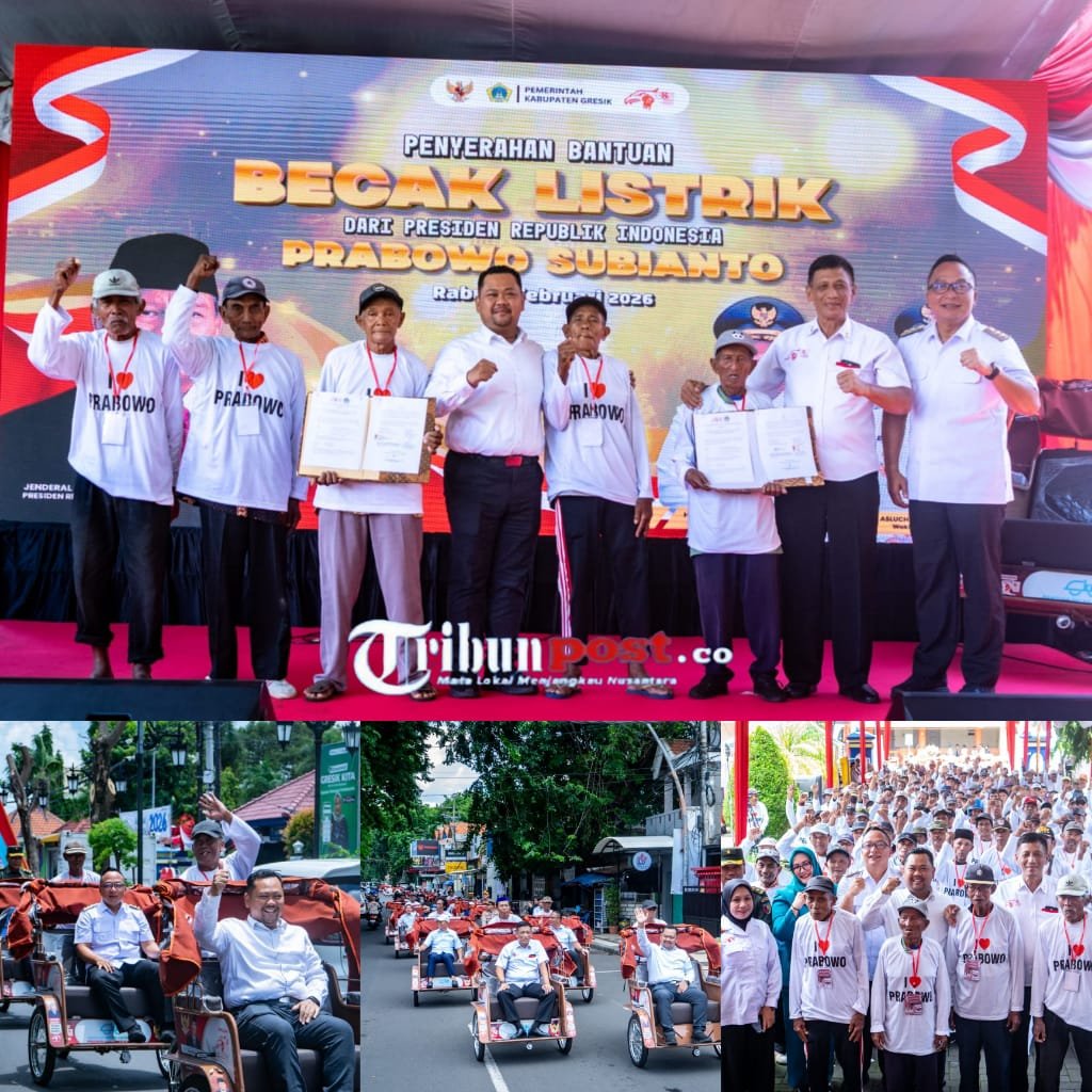 GRESIK , TRIBUNPOST.CO – Bupati Gresik, Fandi Akhmad Yani secara simbolis menyerahkan bantuan becak listrik dari Presiden Republik Indonesia Prabowo Subianto kepada para pembecak lansia di Kabupaten Gresik. Penyerahan bantuan tersebut berlangsung di Rumah Dinas Wakil Bupati Gresik, Rabu (4/2/26).