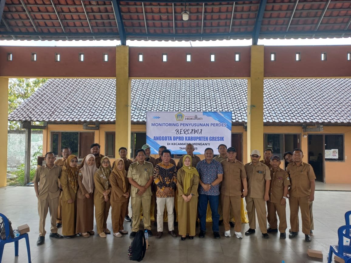 Anggota DPRD Kabupaten Gresik dari Komisi II, Wongso Negoro, bersama Wakil Ketua DPRD Mujid Ridwan, melaksanakan kegiatan monitoring penyusunan Peraturan Desa (Perdes) di Kecamatan Menganti, Senin (03/11/2025).