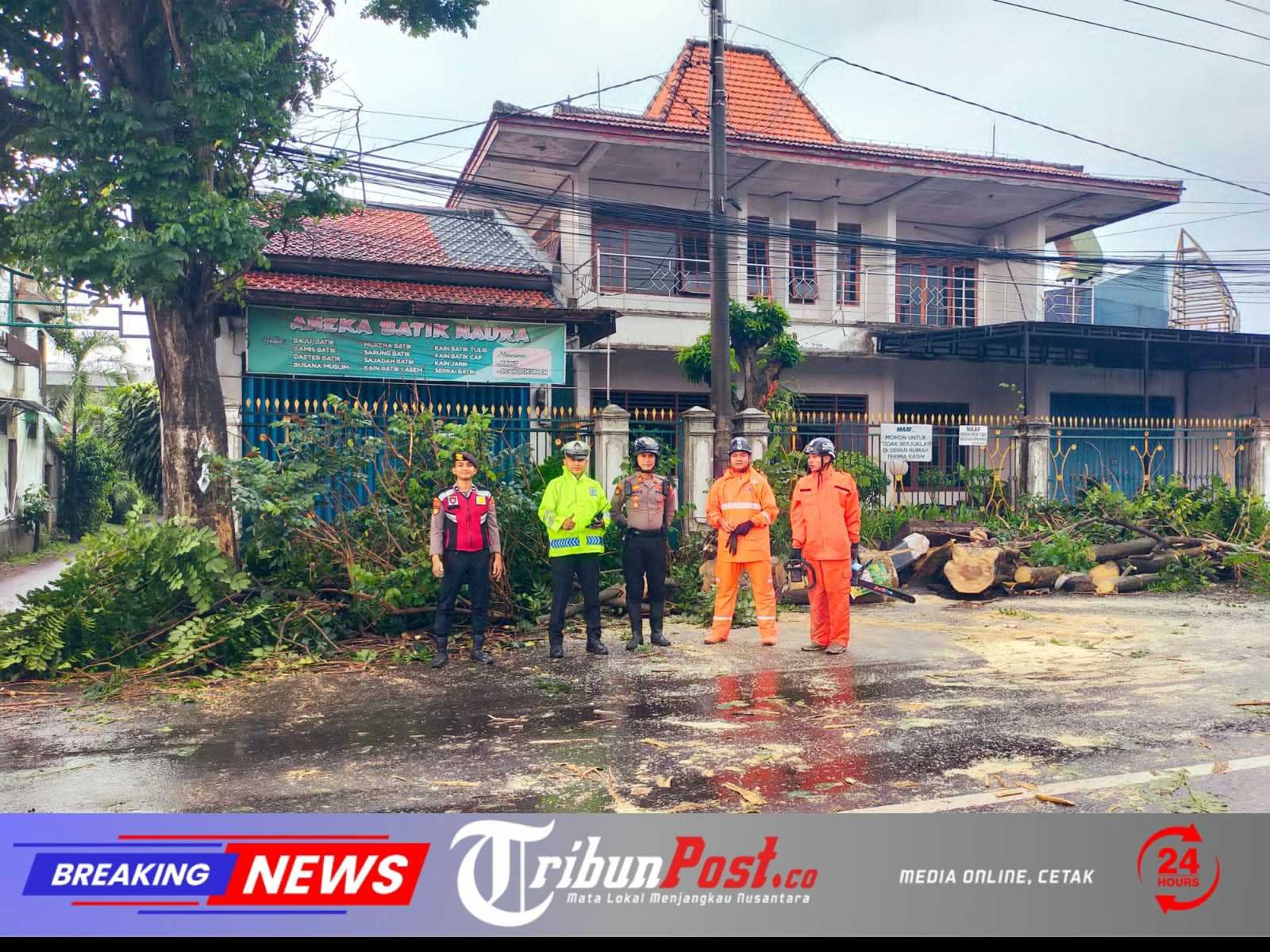 Polisi Kediri Kota bersama BPBD di bantu warga segera bergerak cepat mengevakuasi pohon besar yang tumbang karena melintang di jalan raya hingga menyebabkan kemacetan di Jalur Provinsi tersebut, tumbangnya pohon bersamaan turunya hujan yang lebat yang mengguyur wilayah Kota Kediri sore ini.