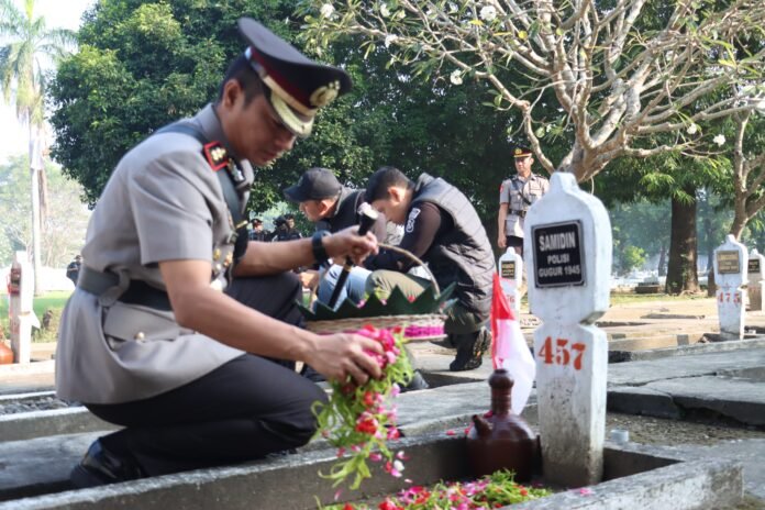 Tribunpost.co || Kota Mojokerto – Untuk mengenang jasa Pahlawan, dalam rangkaian peringatan hari Bhayangkara ke-79 tahun 2025, Polres Mojokerto Kota melaksanakan Upacara Ziarah dan Tabur Bunga di Taman Makam Pahlawan (TMP) Gajah Mada, Jalan Pahlawan, Kota Mojokerto, Senin (23/06/25)