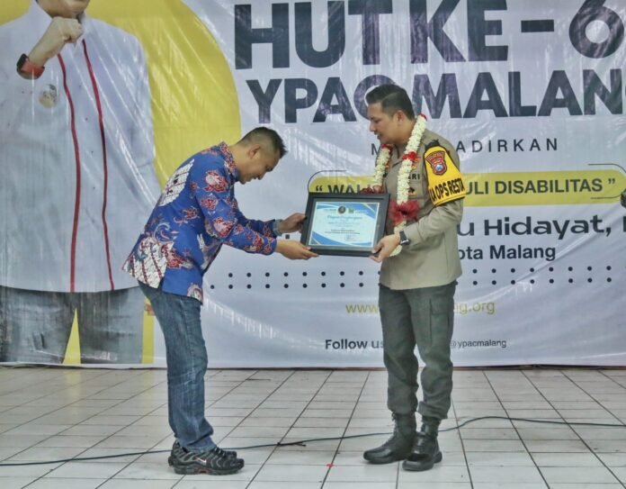 Tribunpost.co || KOTA MALANG – Dalam rangka peringatan HUT ke-69 Yayasan Pembinaan Anak Cacat (YPAC) Kota Malang Ketua Umum YPAC Kota Malang, Dr rerpol Romy Hermawan SSos MAP, memberikan penghargaan khusus kepada Kapolresta Malang Kota, Kombes Pol Budi Hermanto, S.I.K., M.Si.