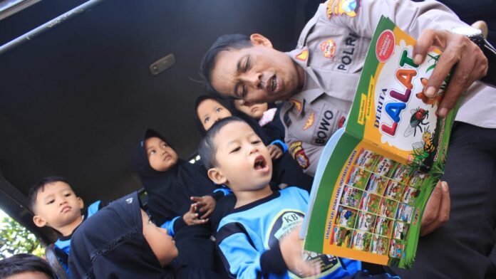 Dalam suasana ceria (Jumat 4/10/2024), AKP Bowo bercerita di depan anak-anak, yang terlihat sangat antusias menyimak setiap kisah yang disampaikan.