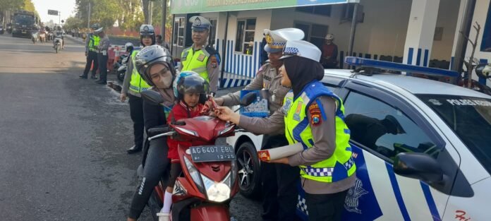 Polisi pun menggunakan cara unik untuk mengedukasi pengendara,salah satunya dengan membagikan kue coklat untuk pengendara yang tertib berlalu lintas yang melintas di Jl Mayor Bismo Kota Kediri, Jum’at (19/7/2024).