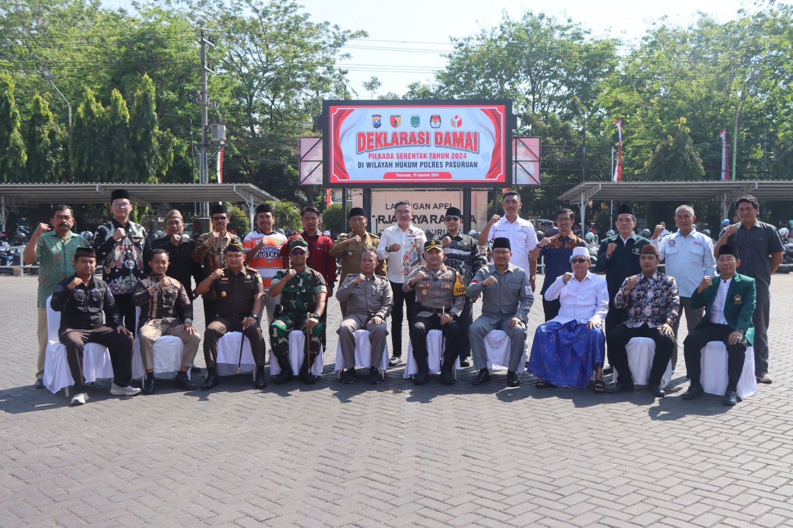 Tribunpost.co || PASURUAN – Polres Pasuruan melaksanakan Deklarasi Damai Pilkada Kabupaten Pasuruan tahun 2024 yang diselenggarakan di Lapangan Sarja Arya Racana Polres Pasuruan, Senin (19/08/2024).
