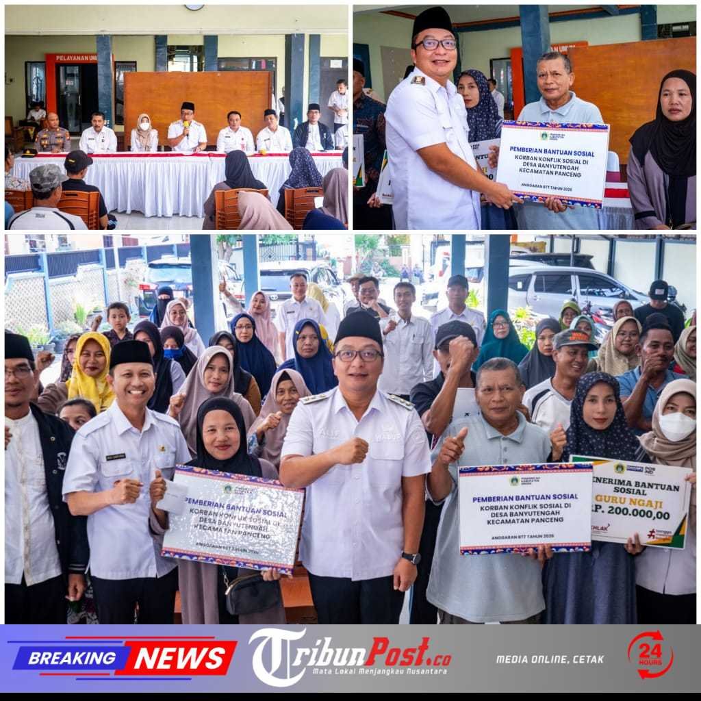 GRESIK , TRIBUNPOST. CO – Pemerintah Kabupaten Gresik menyalurkan bantuan sosial kepada warga terdampak konflik sosial di Desa Banyutengah, Kecamatan Panceng. Bantuan diserahkan secara simbolis di Kantor Kepala Desa Banyutengah kepada 47 warga penerima, Rabu (11/3/2026)..