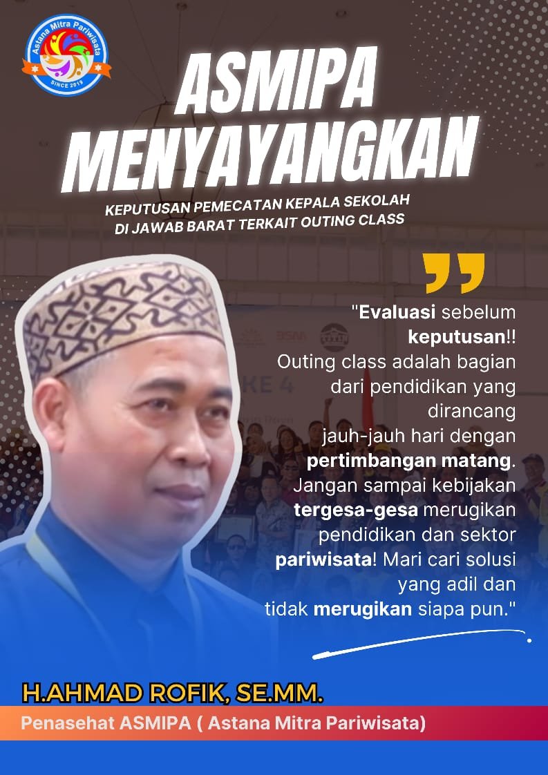 GRESIK,Tribunpost.co – Baru-baru ini, keputusan pemecatan seorang kepala sekolah di Jawa Barat setelah sekolahnya mengadakan kegiatan outing class menuai perhatian publik. Menanggapi hal tersebut, _Penasehat Asosiasi Mitra Pariwisata (ASMIPA),_ Ahmad Rofik SE.,MM.,, menyampaikan pandangannya terkait kebijakan tersebut.