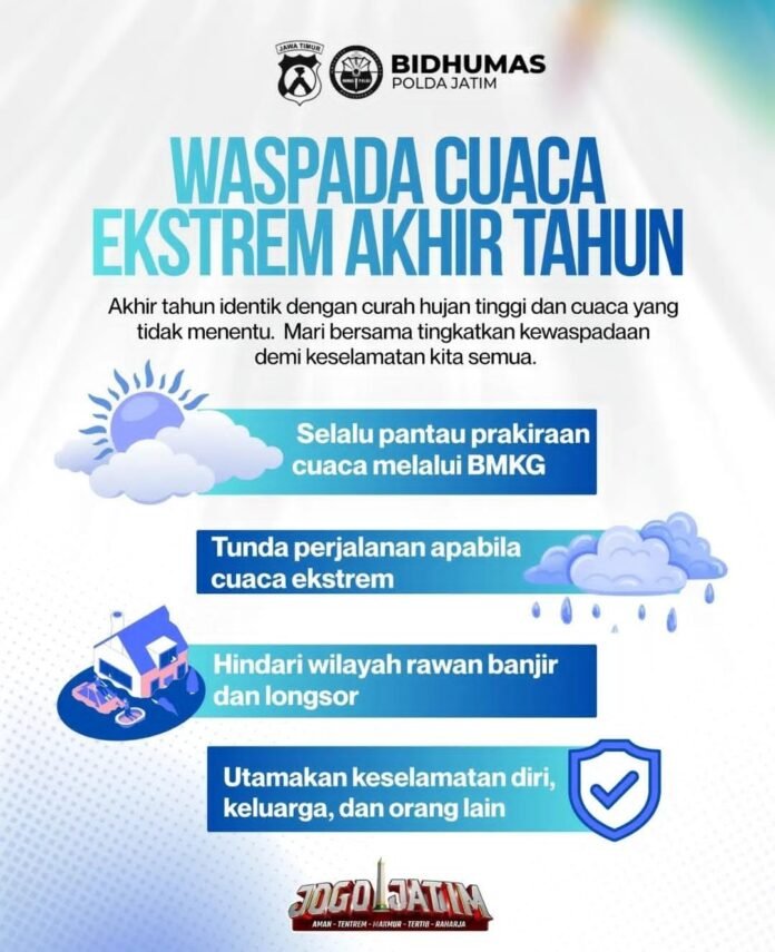 Tribunpost.co || SURABAYA – Polda Jawa Timur mengimbau masyarakat agar meningkatkan kewaspadaan terhadap potensi cuaca ekstrem yang diperkirakan terjadi pada akhir tahun 2025, khususnya di momen libur Natal dan Tahun Baru (Nataru).