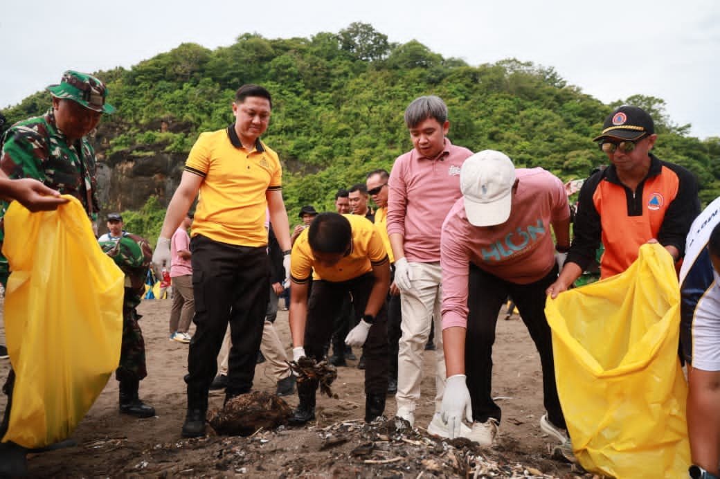 Sejumlah Pejabat Utama Polres Jember, Muspika Kabupaten Jember yang terdiri dari unsur TNI, pemerintah kecamatan, desa, serta elemen masyarakat menyisir dan membersihkan sampah di pesisir pantai.