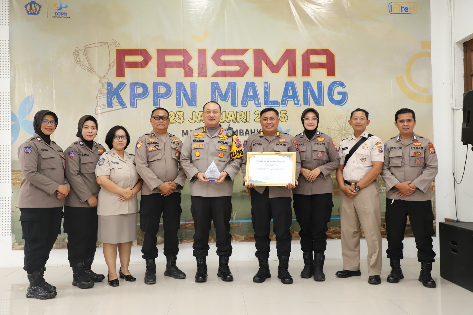 Piagam penghargaan dari KPPN Malang diberikan ke Polresta Malang Kota yang dinilai memiliki kinerja optimal dalam pengelolaan anggaran dengan kategori pagu 70-150 miliar rupiah.