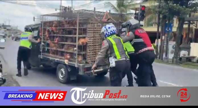 Tampak Tim Urai Polres Blitar Polda Jatim yang dipimpin KBO Lantas, Iptu Putut Siswahyudi bergerak cepat memberikan bantuan kepada pengendara yang mengalami kendaraan mogok di Jalan Raya Kanigoro arah Siraman – Malang.