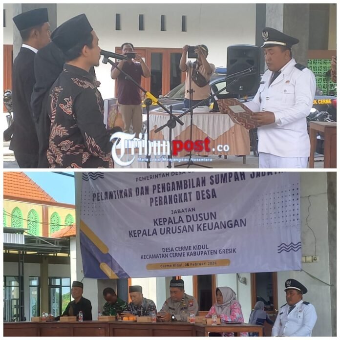 GRESIK , TRIBUNPOST – Kepala Desa Cerme Kidul, Wahyudi Permana, menyampaikan pesan penuh makna kepada perangkat desa yang baru dilantik agar senantiasa mengedepankan sikap sabar dan ikhlas dalam menjalankan tugas pengabdian kepada masyarakat. Pesan tersebut disampaikan dalam acara pelantikan dan pengambilan sumpah perangkat Desa Cerme Kidul yang berlangsung dengan khidmat. Jum’at (6/2/2026).