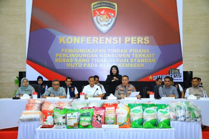 Tribunpost.co || Jakarta, 24 Juli 2025 – Kepolisian Republik Indonesia melalui Satgas Pangan Polri menggelar konferensi pers terkait pengungkapan kasus penjualan beras bermerek yang tidak sesuai dengan standar mutu. Acara ini dibuka oleh Karopenmas Divhumas Polri Brigjen Pol. Trunoyudo Wisnu Andiko, S.I.K., dan dipimpin langsung oleh Direktur Tindak Pidana Ekonomi dan Khusus (Dirtipideksus) Bareskrim Polri, Brigjen Pol. Helfi Assegaf, S.I.K., M.H. selaku Kepala Satgas Pangan Polri.