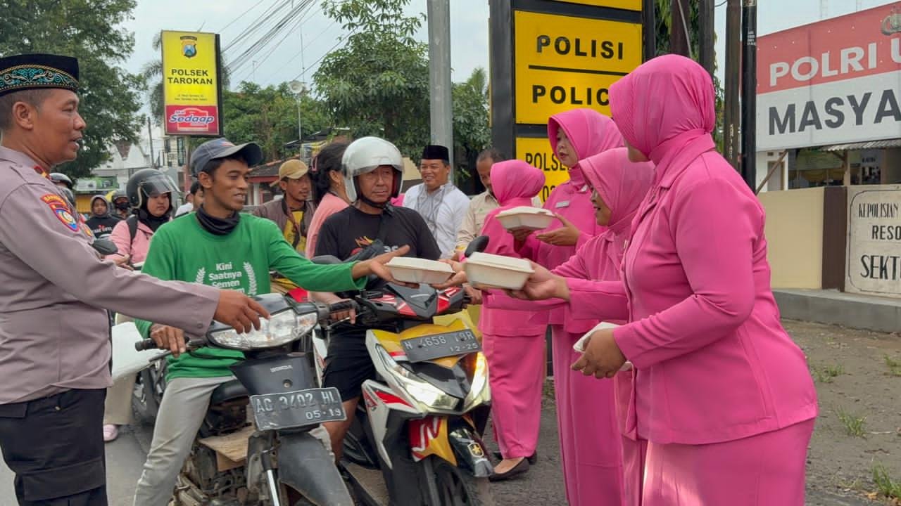 Kegiatan tersebut dipimpin langsung oleh Kapolsek Tarokan AKP Ibnu Sa’i, S.H., didampingi Ketua Bhayangkari Ranting Tarokan serta diikuti personel Polsek dan para pengurus Bhayangkari. Ratusan paket takjil dibagikan kepada para pengguna jalan dan warga sekitar yang melintas menjelang waktu berbuka puasa.