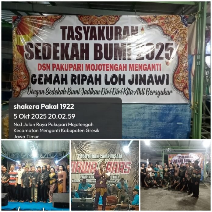 Gresik, 5 Oktober 2025 — Suasana penuh kebersamaan dan kegembiraan tampak menyelimuti Dusun Pakupari, Desa Mojotengah, Kecamatan Menganti, Kabupaten Gresik, pada malam Tasyakuran Sedekah Bumi 2025.