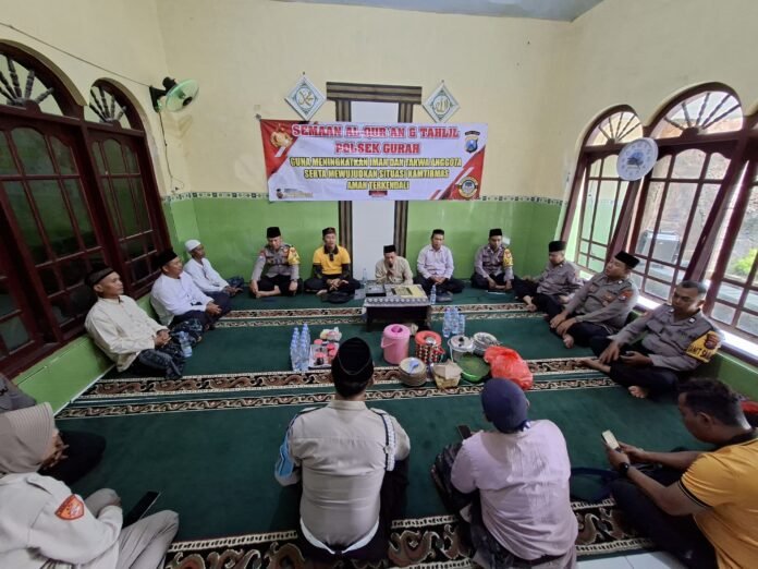 Tribunpost.co || Kediri – Dalam rangka meningkatkan keimanan dan mempererat sinergitas antar unsur pimpinan kecamatan, Polsek Gurah kembali menggelar kegiatan Semaan Al-Qur’an rutinan yang dirangkai dengan tahlil bersama unsur Muspika.