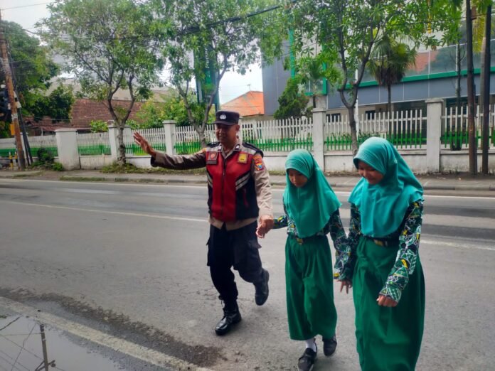 Krian,Tribunpost.co – Dalam wujud pelayanan prima kepada masyarakat, khususnya pelajar sekolah dasar, anggota Samapta Polsek Krian, Aiptu Masroni, tampak sigap membantu anak-anak SD menyeberang jalan sepulang sekolah di wilayah Krian, Kamis (06/11/2025). Kegiatan tersebut dilakukan di titik-titik rawan kemacetan dan padat arus lalu lintas, guna memberikan rasa aman kepada para pelajar saat melintas di jalan raya.