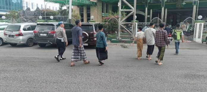 Anggota Polsek Krian tampak sigap membantu jamaah menyeberang jalan dan menjaga situasi tetap tertib di depan masjid. Kehadiran polisi di tengah masyarakat ini menunjukkan komitmen Polsek Krian dalam menjaga keamanan serta ketertiban, khususnya pada saat kegiatan keagamaan berlangsung.